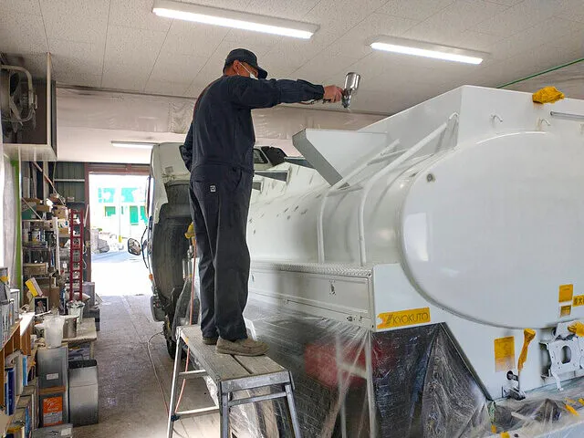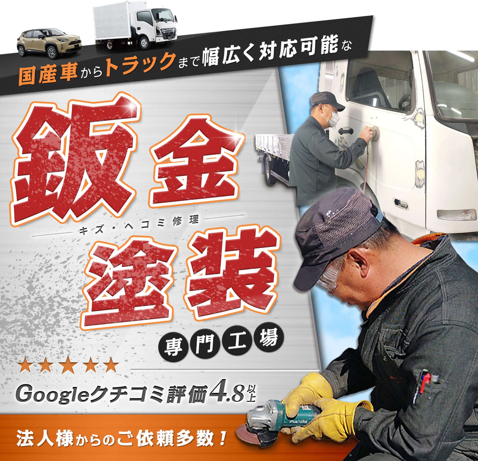 国産オールメーカー全車種の普通車から、トラック・ダンプ・クレーン車の鈑金塗装まで対応できる充実設備を完備。