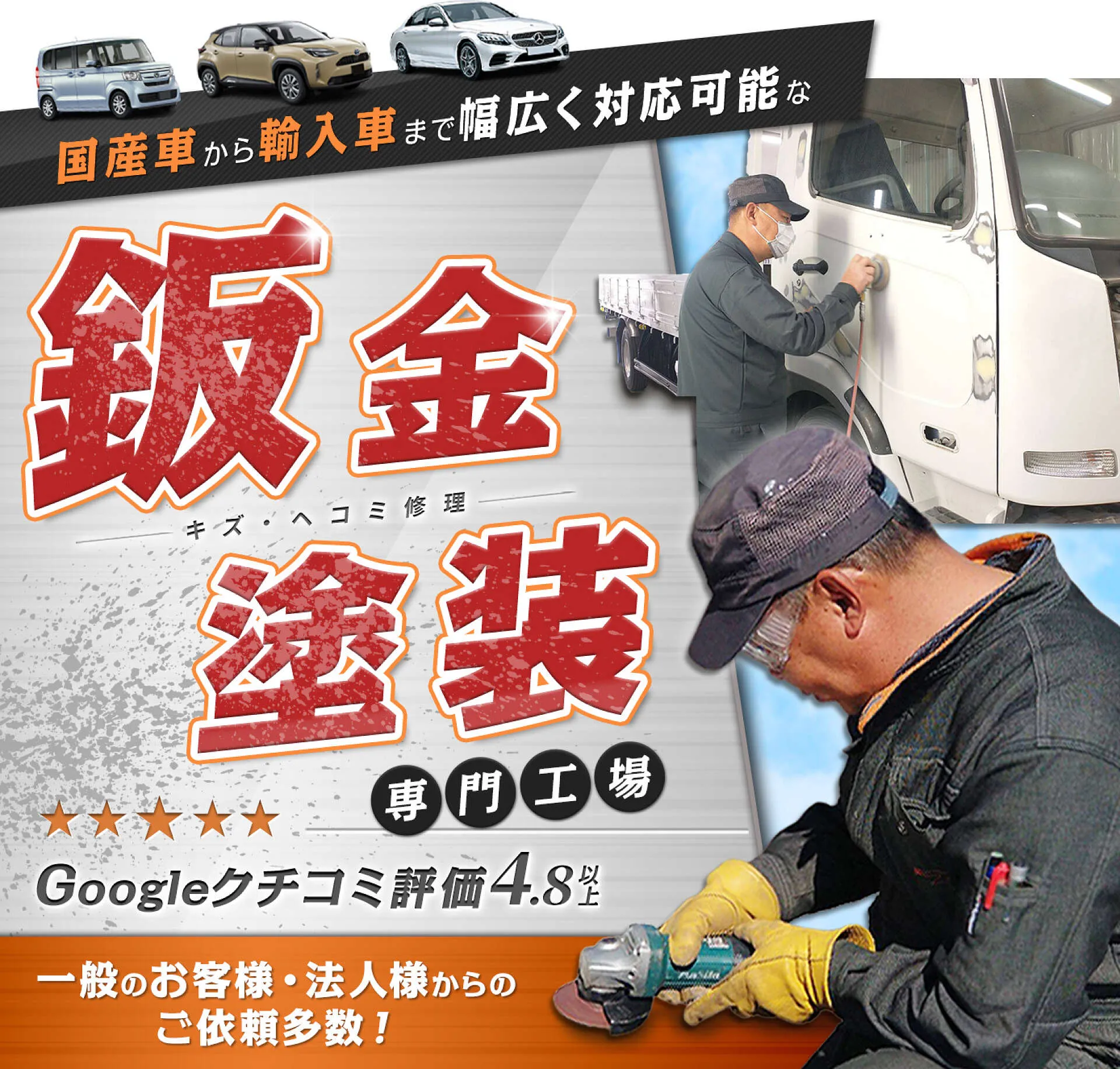 国産オールメーカー全車種の普通車から、ベンツ・BMW・アウディ・フォルクスワーゲン・MINIなど、輸入車の鈑金塗装もお任せください。