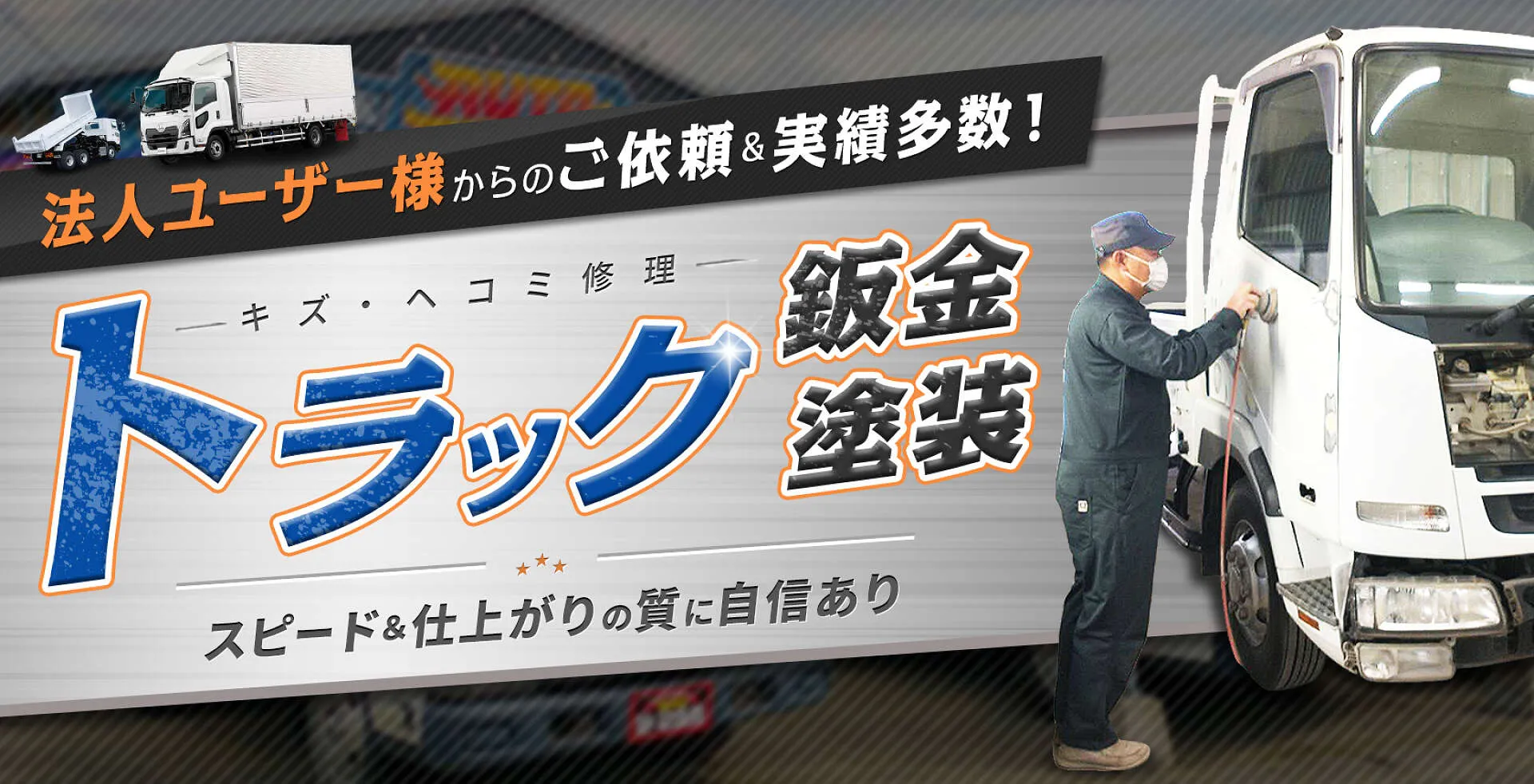 国産オールメーカー全車種の普通車から、トラック・ダンプ・クレーン車の鈑金塗装まで対応できる充実設備を完備。