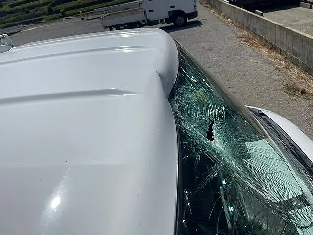 フロントガラスとルーフの一部が大きく損傷してしまっています。お話をお伺いすると、高速道路を走行中に、前を走るトラックからの落下物がぶつかったとのこと。落下物による被害は、予想外の出来事なので、かなり怖い想いをされたようです…。幸い、お客様にケガは無かったことが不幸中の幸いですね。